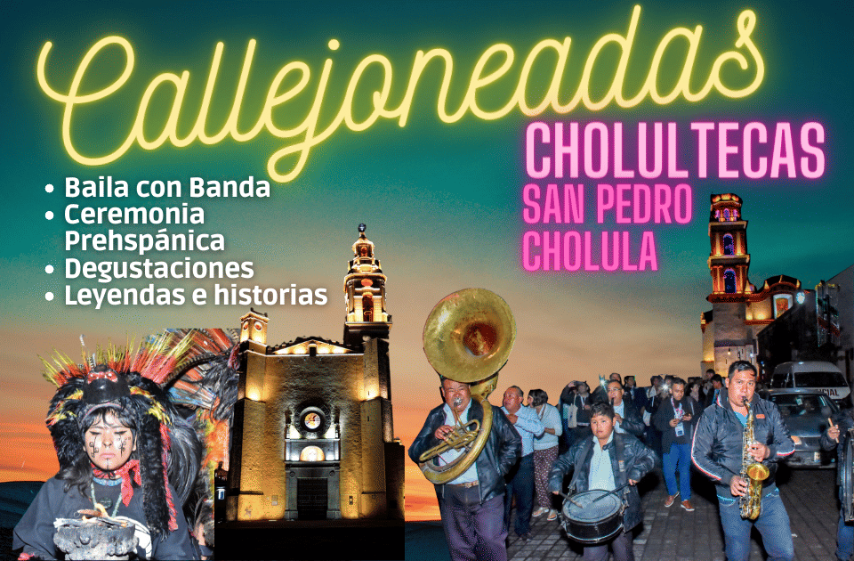 “Callejoneadas Cholultecas” es un tour para que los visitantes y locales tengan una experiencia divertida e inmersiva en la historia, cultura y tradiciones de Cholula, como es lo son su música tradicional de banda, ceremonia prehispánica, leyendas, mitos e historia sobre Cholula y degustaciones de bebidas y gastronomía local.
